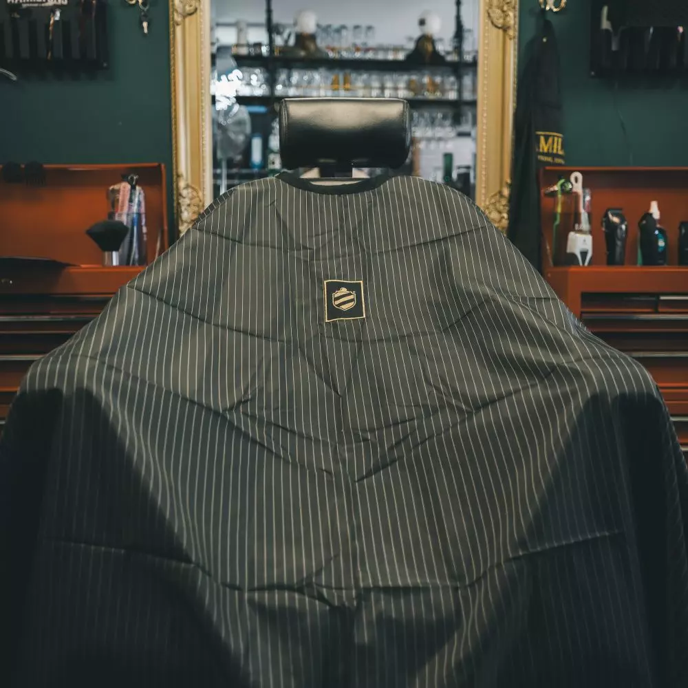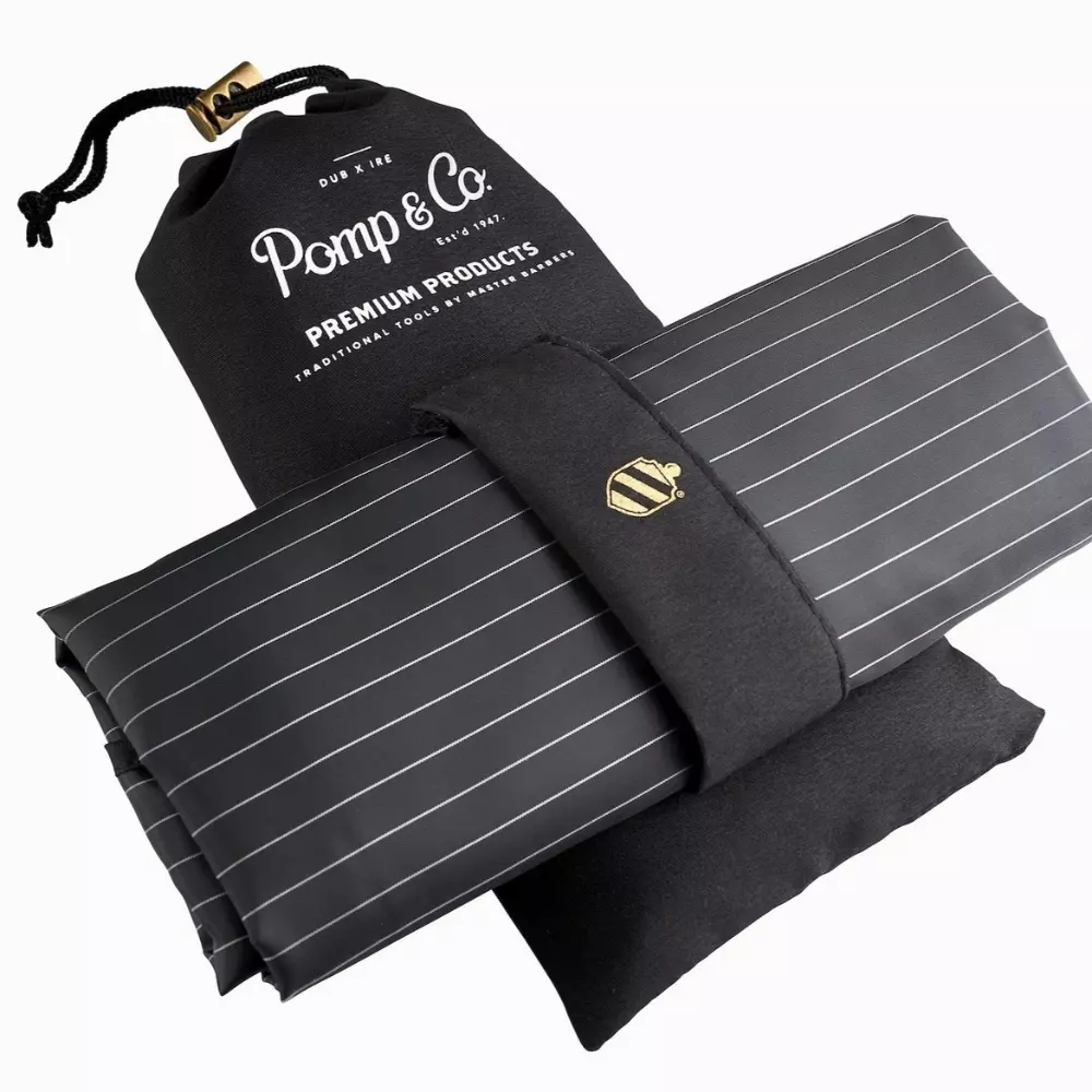 Pomp & Co. Barber Cape - Peleryna fryzjerska to synonim rzemieślniczej precyzji prosto z Irlandii, stworzony z myślą o profesjonalistach oraz entuzjastach domowego strzyżenia. Klasyczna czerń przełamana subtelnymi białymi prążkami nadaje jej ponadczasowy, elegancki charakter, który dopełniają prestiżowe detale: tkana złotą nicią tarcza oraz ozdobny guzik pełniący funkcję zapięcia. Stosując Pomp & Co. Barber Cape - pelerynę fryzjerska, zapewniasz swoim klientom lub sobie najwyższy komfort dzięki lekkiemu i oddychającemu materiałowi, który nie krępuje ruchów i pozwala na swobodny przepływ powietrza. To akcesorium, które w nienachalny sposób podnosi estetykę każdego stanowiska barberskiego, łącząc tradycyjne wzornictwo z nowoczesną funkcjonalnością.